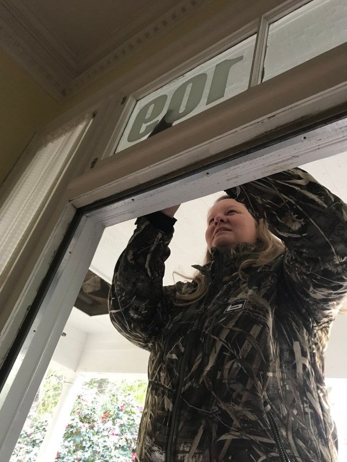 Nancy helping protect our stuff from paint being sprayed!