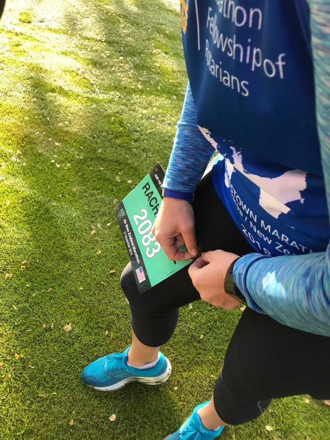 Putting on my running bib with my name on it. - Flat out Beautiful is the only thing flat in Queenstown – it is incredibly hilly! For this coastal South Carolina girl, the hills were crazy! The only “Hill” we have in Charleston is the bridge. Very different here in Queenstown! There are so many hills. My Garmin tracked 1,135 feet of elevation gain through the course…I think that’s way under calculated 🙂